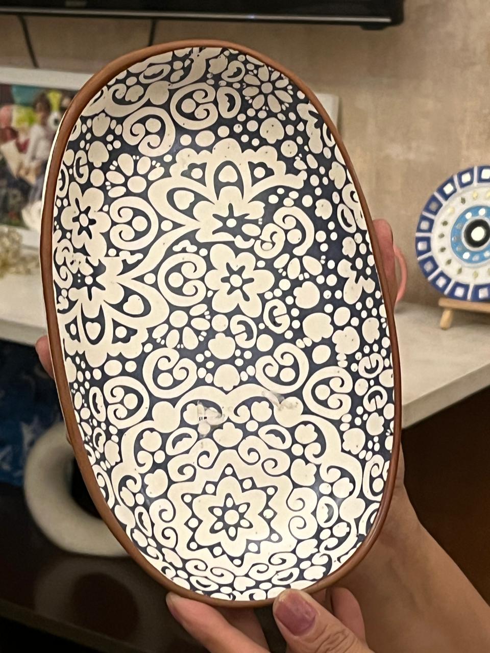 An elegant oval ceramic platter adorned with intricate navy floral patterns on a cream background. Perfect for serving snacks or appetizers, this piece combines functionality with artistic charm.