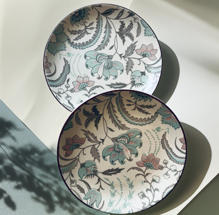 Delicate floral platters in soft pastel tones — graceful, vintage-inspired charm.