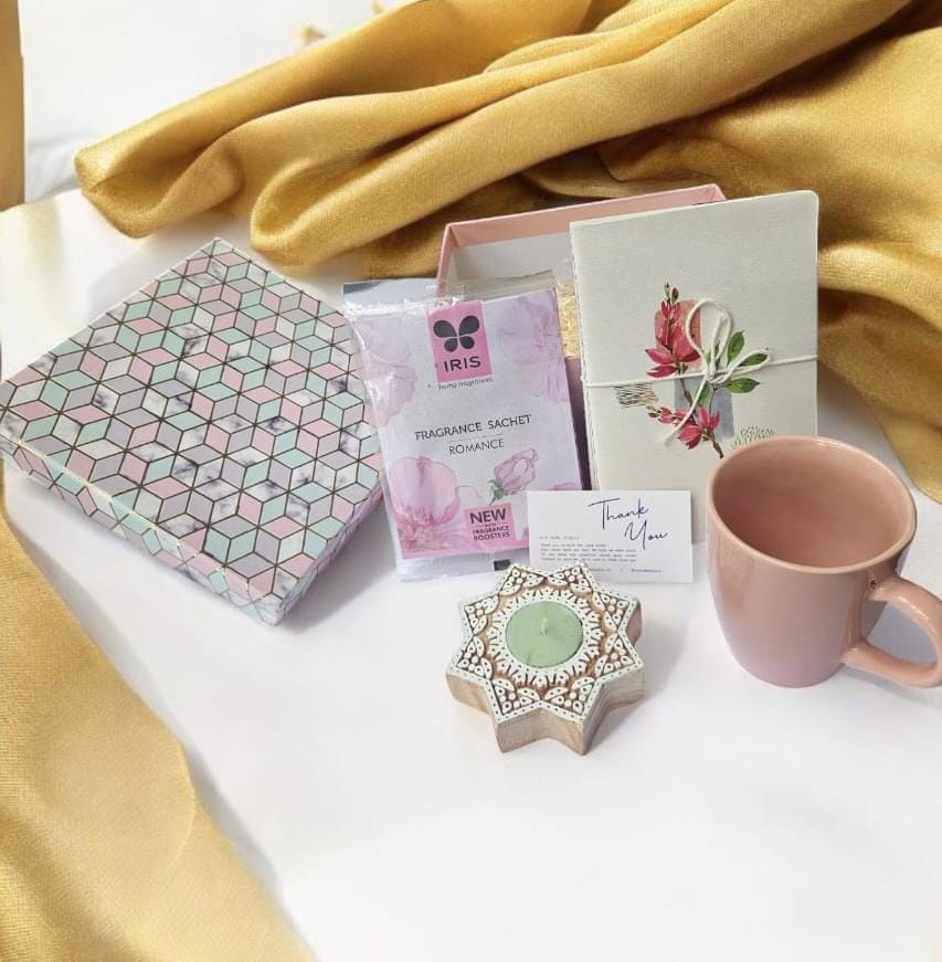 Elevate your gift-giving or treat yourself to this delightful ensemble that brings together aromatherapy, stationery, and home decor in a harmonious blend of soft colors and textures."